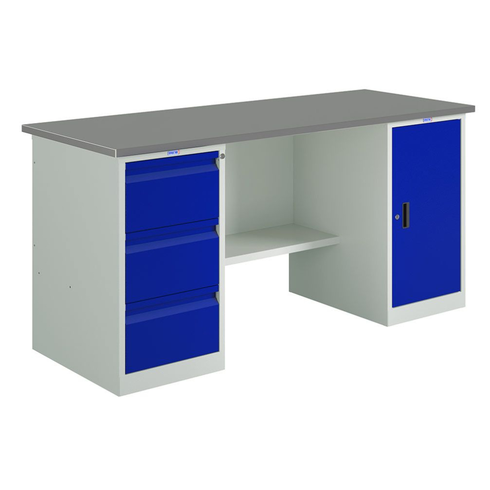 Корпус тумбы – серый (RAL 7038, шагрень), ящики тумбы, дверца тумбы – синий (RAL 5002, шагрень)